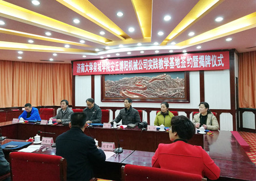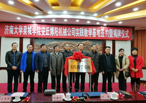 2016年12月30日,濟(jì)南大學(xué)泉城學(xué)院與安丘博陽(yáng)機(jī)械公司實(shí)踐教學(xué)基地掛牌儀式隆重舉行。泉城學(xué)院劉增夕副院長(zhǎng)、安丘博陽(yáng)機(jī)械閆吉祥總經(jīng)理、