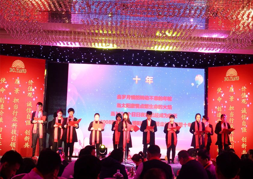 歡樂在繼續,熱情在高漲!安丘博陽機械數據中心的詩朗誦《十年精彩,共筑輝煌》,引爆了大會的高潮。詩歌分為四大部分:十年、歷程、感恩、展望!從2008年6月19日到現在,安丘博陽機械已經走過了十個年頭。十年奮斗和進取、十年功勛和業績;十年磨礪十年拼搏,鑄就了我們安丘博陽機械鋼鐵般的品牌信譽,和我們博陽人堅韌和抱負!回首,來時的路是泥濘的,但是只有泥濘的道路才能留下腳印;來時的路是坎坷的,但是只有遇到困難才能有下一步的成長!