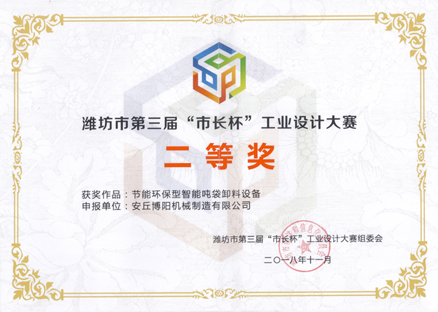 本屆“市長杯”工業設計大賽自啟動以來,共收到參賽作品197件,經過專家組評審,共評選出獲獎作品40件。本屆大賽的頒獎儀式于2018年12月25日隆重舉行,安丘博陽機械制造有限公司的設計作品《節能環保型智能噸袋卸料設備》榮獲二等獎。