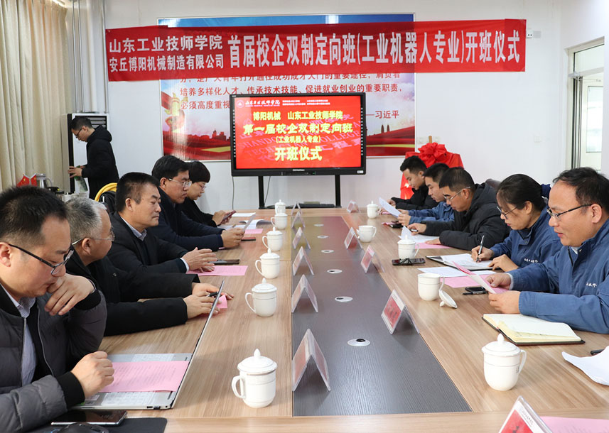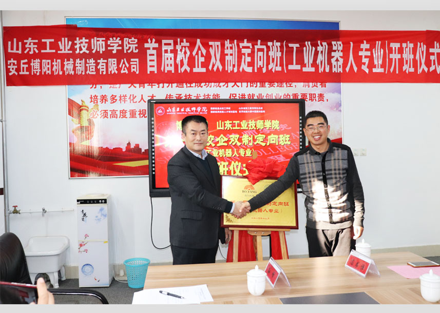 2019年12月24日上午10點(diǎn),首屆“博陽(yáng)校企雙制定向班(工業(yè)機(jī)器人專(zhuān)業(yè))”開(kāi)班儀式在山東工業(yè)技師學(xué)院舉行,山東工業(yè)技師學(xué)院教務(wù)處李新功處長(zhǎng)參加并致辭,現(xiàn)代制造工程系周明鋒主任與閆吉祥總經(jīng)理進(jìn)行揭牌,并為孫紅金副總經(jīng)理頒發(fā)“博陽(yáng)校企雙制定向班”班主任聘書(shū),閆吉祥總經(jīng)理為周明鋒主任頒發(fā)博陽(yáng)機(jī)械“技術(shù)顧問(wèn)”聘書(shū),齊魯理工大學(xué)王佐勛教授及公司郭偉總經(jīng)理、李文明副總經(jīng)理一同參加活動(dòng)。