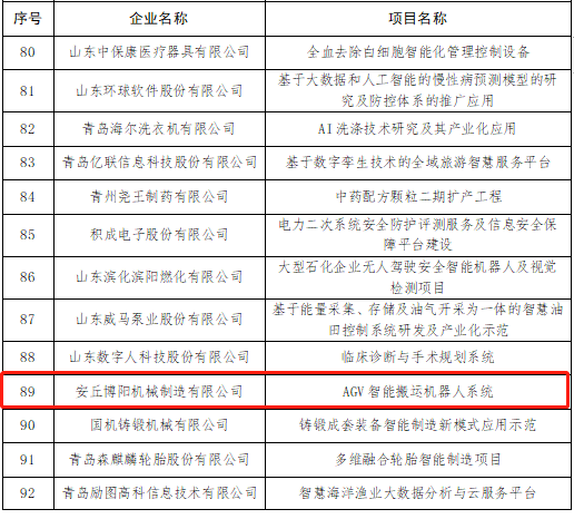 為貫徹落實省委省政府關(guān)于推進“現(xiàn)代優(yōu)勢產(chǎn)業(yè)集群+人工智能”的工作部署,省工信廳組織開展了第二批“現(xiàn)代優(yōu)勢產(chǎn)業(yè)集群+人工智能”試點示范企業(yè)及項目的征集遴選工作,經(jīng)企業(yè)申報、十強產(chǎn)業(yè)專班及各市工信局、有關(guān)行業(yè)協(xié)會等推薦、專家評審,評選了221個試點示范企業(yè)和項目。安丘博陽機械的“AGV智能搬運機器人系統(tǒng)”項目成功入選。