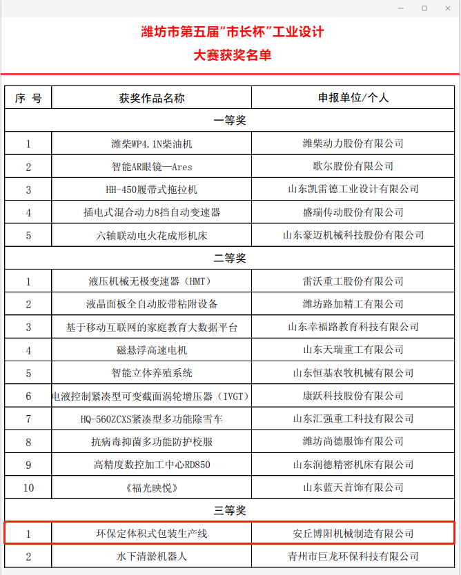 根據《濰坊市人民政府辦公室關于印發濰坊市第五屆“市長杯”工業設計大賽工作方案的通知》(濰政辦字〔2020〕52號)要求,經專家組嚴格評審和網上公示,并經市政府同意,安丘博陽機械“環保定體積式噸袋包裝機”被授予第五屆“市長杯”工業設計大賽三等獎,特此祝賀。