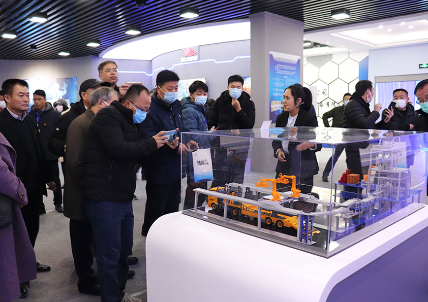 閆總經理在展示車間就目前公司研發的反應釜投放料機器人、智能集裝箱裝車線、智能噸袋連續拆包機、高速拆垛裝車機、全自動廢袋打包纏繞機、陣列式重力拆垛機等產品進行了詳細講解及現場演示,并在企業展廳對公司的發展歷程、企業文化、專利資質、產學研合作等內容向各位領導作了全面介紹。