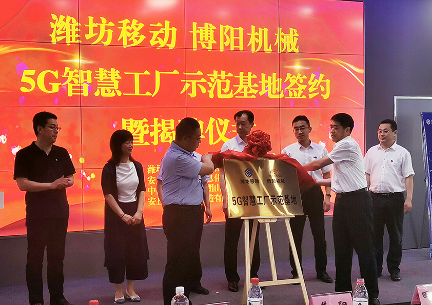2021年6月11日上午,濰坊移動&博陽機械5G智慧工廠示范基地簽約暨揭牌儀式在博陽機械展廳內隆重舉行,濰坊市工信局四級調研員韓志東、博陽機械總經理閆吉祥、濰坊市工信局工業互聯網科副科長趙建全、安丘市工信局信息化推進科科長宋曉東、中國移動通信集團山東有限公司DICT中心副總經理田經師、中國移動通信集團山東有限公司DICT中心5G專家于鵬、及中國移動濰坊分公司副總經理焦陽出席本次活動。