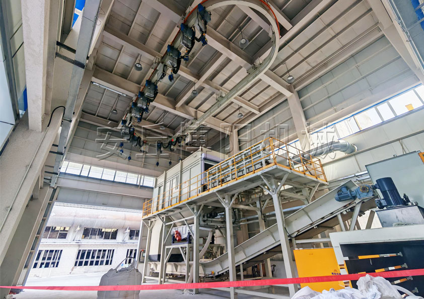不落地噸袋全自動拆包機實現拆包輸送成套設備的吊裝、稱重、固定、整形、拆包、取樣、拍打、脫鉤、回程、輸送、收塵等整個流程的高度自動化、智能化穩定運行。