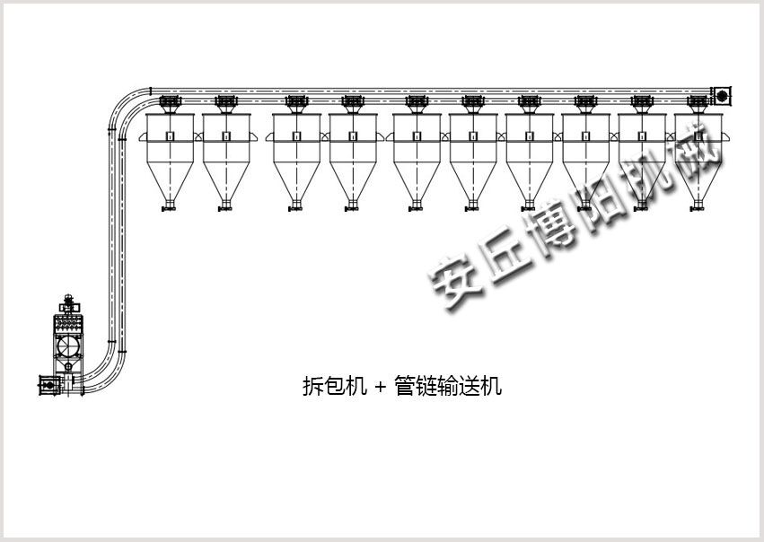 四、多點出料管鏈輸送機應用:可給多個料倉、多個反應釜、多臺混合機、多臺設備供料 等