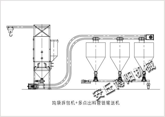 5、破袋、卸料、分離后與其它輸送設備配套使用可完成粉體輸送儲存等功能。